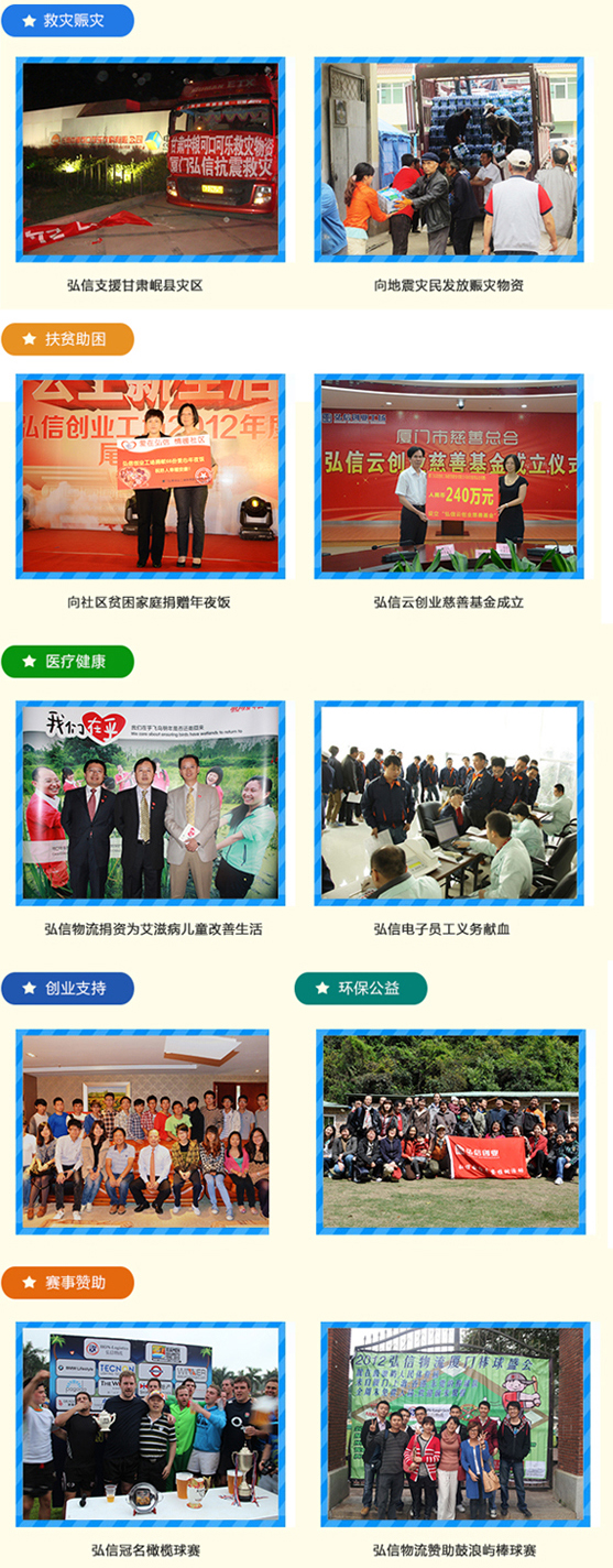 富有使命感,勇于承擔社會(huì )責任,是弘信企業(yè)價(jià)值觀(guān)的重要組成部分。在企業(yè)發(fā)展壯大的同時(shí),弘信始終懷著(zhù)高度的社會(huì )責任感,關(guān)注民生和社會(huì )發(fā)展,多形式積極回饋社會(huì )。除無(wú)償宣導和分享創(chuàng )業(yè)經(jīng)驗外,公司也積極投身社會(huì )公益事業(yè),不斷加大救災賑災和扶貧濟困力度。關(guān)愛(ài)愛(ài)滋兒童,關(guān)注生態(tài)綠色環(huán)保,支持贊助運動(dòng)賽事,連續多年組織員工義務(wù)獻血等等,2013年聯(lián)合廈門(mén)市慈善總會(huì ),投入240萬(wàn)元發(fā)起設立弘信云創(chuàng )業(yè)慈善基金,資助貧困高考學(xué)子圓夢(mèng)大學(xué)。弘信以實(shí)際行動(dòng)努力踐行自己的社會(huì )擔當,并將力圖為社會(huì )、為公眾做出更多貢獻。